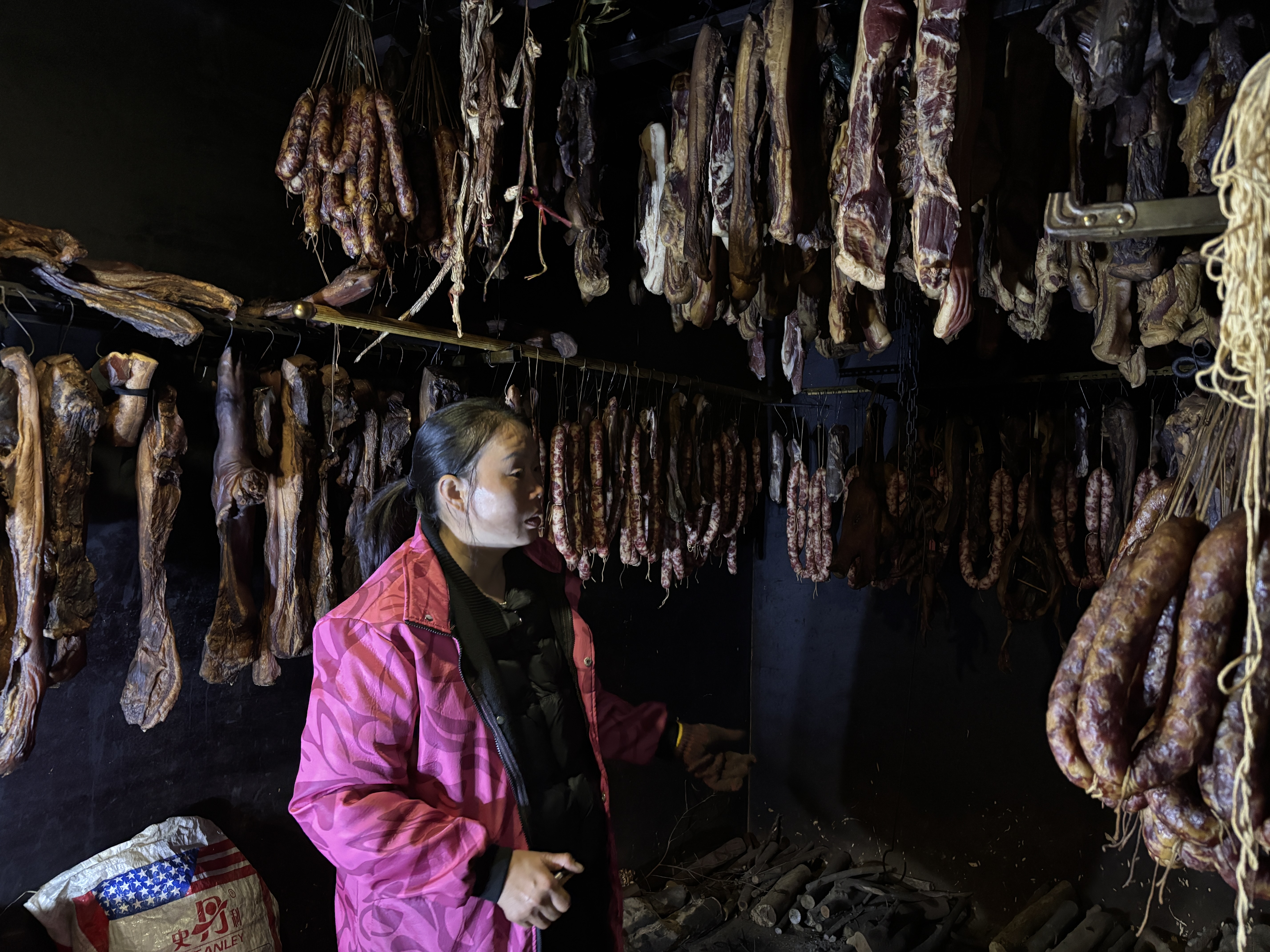 林林带我们走进了她的宝藏储藏室,这看似普通的住宅竟另有一番天地。还没走进屋,就闻到了腊肉飘过来的香气,只见这屋内的四周和屋顶挂满了她自制的腊肉和腊肠,全部都已经完成了基础的熏干工作,散发着磨砂的质感和香味。