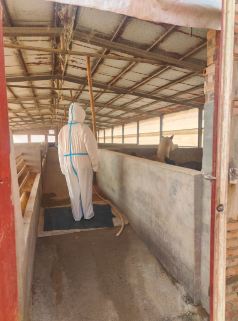 为了增强实地调研的真实性,调查组决定亲自进入养猪场内考察养殖环境。在进去之前,场主拿出了一件防护服给调查组人员穿上,并且在门口放置了一桶消毒水,要求任何人进去之前都要将鞋底过一遍消毒水。